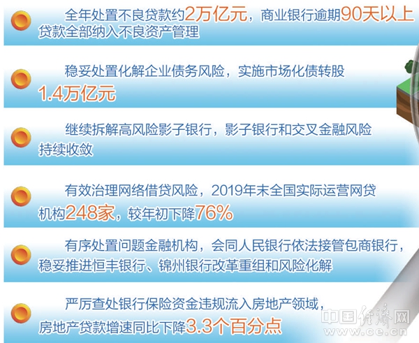 銀保監(jiān)會副主席黃洪介紹,2019年銀保監(jiān)會持續(xù)加強金融監(jiān)管,堅決治理市場亂象,妥善處置重點風(fēng)險,平衡好穩(wěn)增長和防風(fēng)險的關(guān)系,防范化解金融風(fēng)險攻堅戰(zhàn)取得了關(guān)鍵進展。全年處置不良貸款約2萬億元,商業(yè)銀行逾期90天以上貸款全部納入不良資產(chǎn)管理;穩(wěn)妥處置化解企業(yè)債務(wù)風(fēng)險,實施市場化債轉(zhuǎn)股1.4萬億元;繼續(xù)拆解高風(fēng)險影子銀行,影子銀行和交叉金融風(fēng)險持續(xù)收斂;有效治理網(wǎng)絡(luò)借貸風(fēng)險,2019年末全國實際運營網(wǎng)貸機構(gòu)248家,較年初下降76%;有序處置問題金融機構(gòu),會同人民銀行依法接管包商銀行,穩(wěn)妥推進恒豐銀行、錦州銀行改革重組和風(fēng)險化解;堅決抑制房地產(chǎn)金融化泡沫化,嚴(yán)厲查處銀行保險資金違規(guī)流入房地產(chǎn)領(lǐng)域,房地產(chǎn)貸款增速同比下降3.3個百分點。