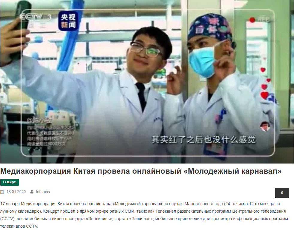 俄羅斯信息通訊社1月18日轉(zhuǎn)發(fā)相關(guān)報道稱,中國中央廣播電視總臺17日晚舉辦了“青年狂歡節(jié)”網(wǎng)絡(luò)聯(lián)歡晚會。