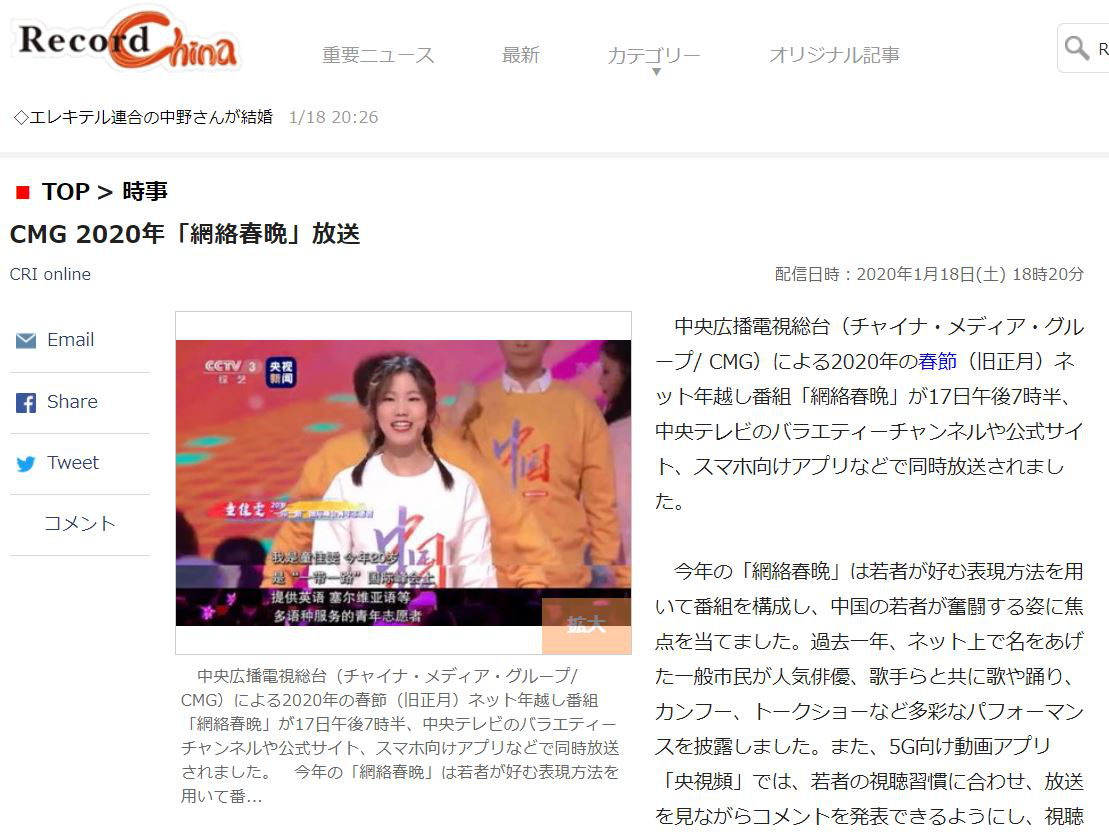 日本最大的中國新聞網(wǎng)站“Record China”18日發(fā)布題為《中央廣播電視總臺2020年網(wǎng)絡(luò)春晚播出》的報道。報道稱,今年的網(wǎng)絡(luò)春晚采用了年輕人喜愛的表現(xiàn)方式,聚焦中國年輕人奮斗的姿態(tài)。