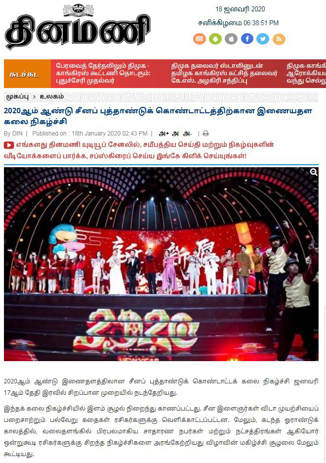 印度主流泰米爾文媒體《每日鐘聲報》網(wǎng)站刊發(fā)2020年中央廣播電視總臺網(wǎng)絡(luò)春晚的報道稱,作為除夕夜央視春晚的序曲,網(wǎng)晚打通線上線下、貫通小屏大屏,力推多款融媒體產(chǎn)品,打造出一場極具參與感的“青春嘉年華”。