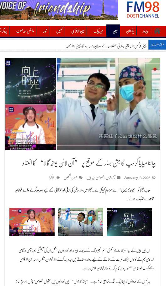 巴基斯坦中巴友誼臺官網(wǎng)——中巴友誼網(wǎng)1月18日轉(zhuǎn)載中央廣播電視總臺烏爾都語報道稱,這臺盛大的網(wǎng)絡(luò)晚會以“青春嘉年華”命名,突出了青年們感興趣的話題和生活方式。此外,晚會上還使用了各種新技術(shù)與觀眾互動。