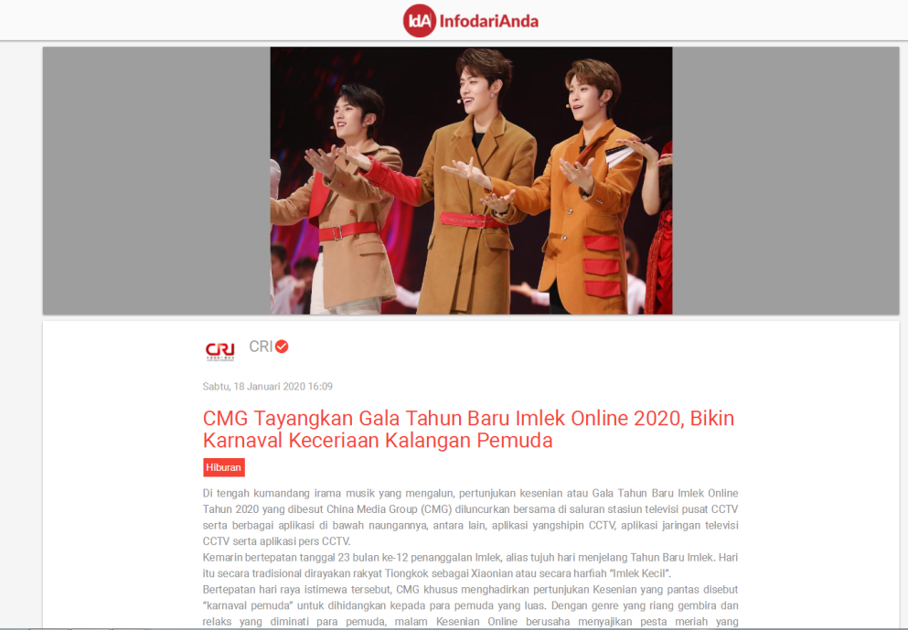 印尼艾爾辛達電臺網(wǎng)站(Radio Elshinta)1月18日轉(zhuǎn)發(fā)總臺2020年網(wǎng)絡(luò)春節(jié)聯(lián)歡晚會稿件,文章稱晚會以新媒體和傳統(tǒng)平臺互動的形式令人耳目一新,大數(shù)據(jù)的應(yīng)用也讓更多的人了解了中國新時代互聯(lián)網(wǎng)用戶們的生活情景。