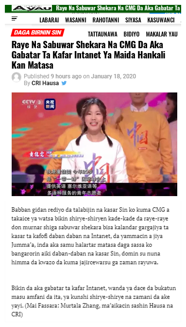 非洲最有影響的豪薩語報紙尼日利亞《領(lǐng)導(dǎo)者報》對中央廣播電視總臺2020年網(wǎng)絡(luò)春晚進行了報道。報道稱,網(wǎng)絡(luò)春晚上,來自天南海北、各行各業(yè)的年輕朋友們一起致敬奔跑的時代和追夢的青春,傳遞出青年的昂揚風(fēng)采。