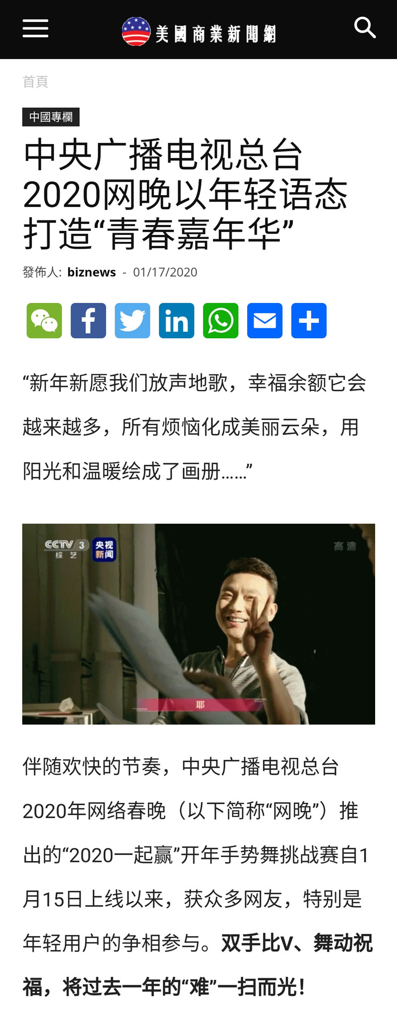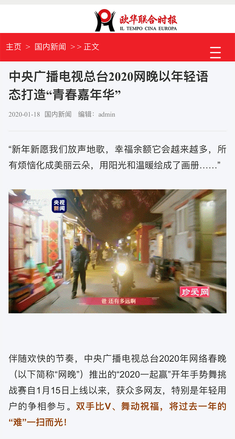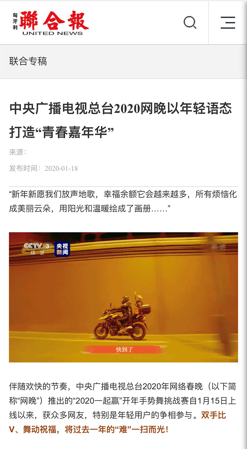 《美國商業(yè)新聞網(wǎng)》《歐華聯(lián)合時報》《匈牙利聯(lián)合報》也分別以《中央廣播電視總臺2020網(wǎng)晚以年輕語態(tài)打造“青春嘉年華”》對總臺2020年網(wǎng)絡(luò)春晚進行了報道。