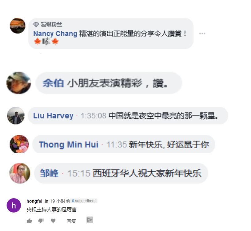 眾多海外華人網(wǎng)友留言表達對總臺2020網(wǎng)絡(luò)春晚的喜愛。
