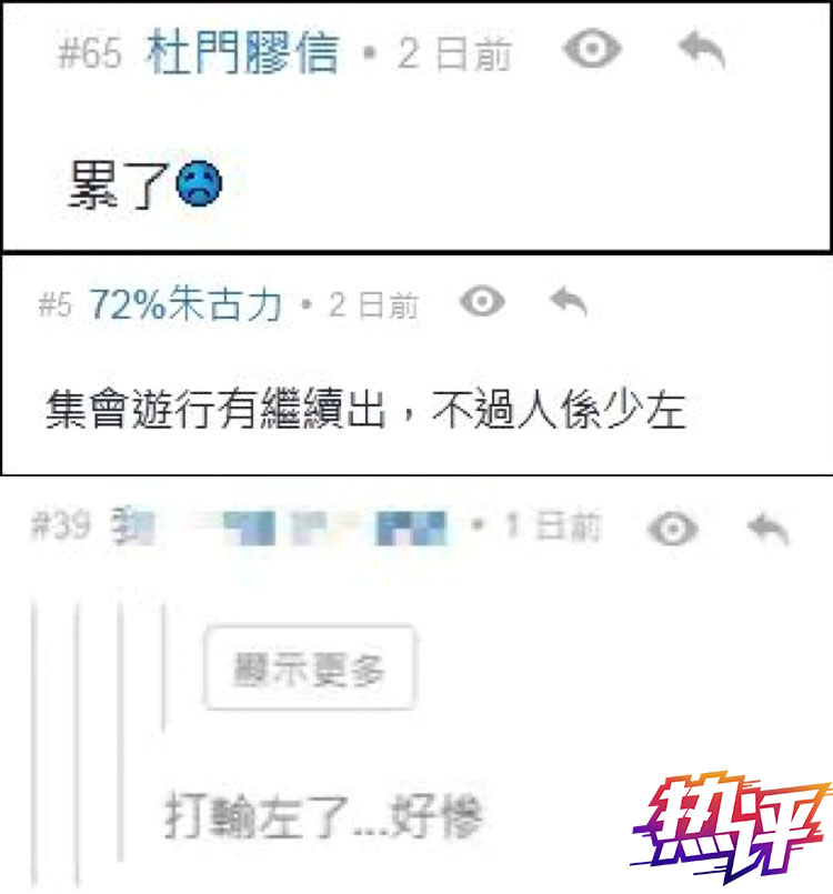 近日,多名曾參與游行活動的暴徒在網(wǎng)上發(fā)帖詢問“同伙”:“覺不覺得身邊很多人已經(jīng)開始重新正常生活?”有一位暴徒發(fā)帖稱,自己身邊不少人已經(jīng)陸續(xù)開始按部就班地努力上班,籌備買房,之前曾出來參與游行集會的,現(xiàn)在都已經(jīng)不出來了。他最后又強(qiáng)調(diào),自己并不是想散播這種“悲觀”情緒,但事實(shí)就是如此。許多人在下面留言表示認(rèn)同,稱“人確實(shí)越來越少了……”。還有人表示對前途感到迷茫,直言真的“累了”,再不上班就沒錢生活下去了……