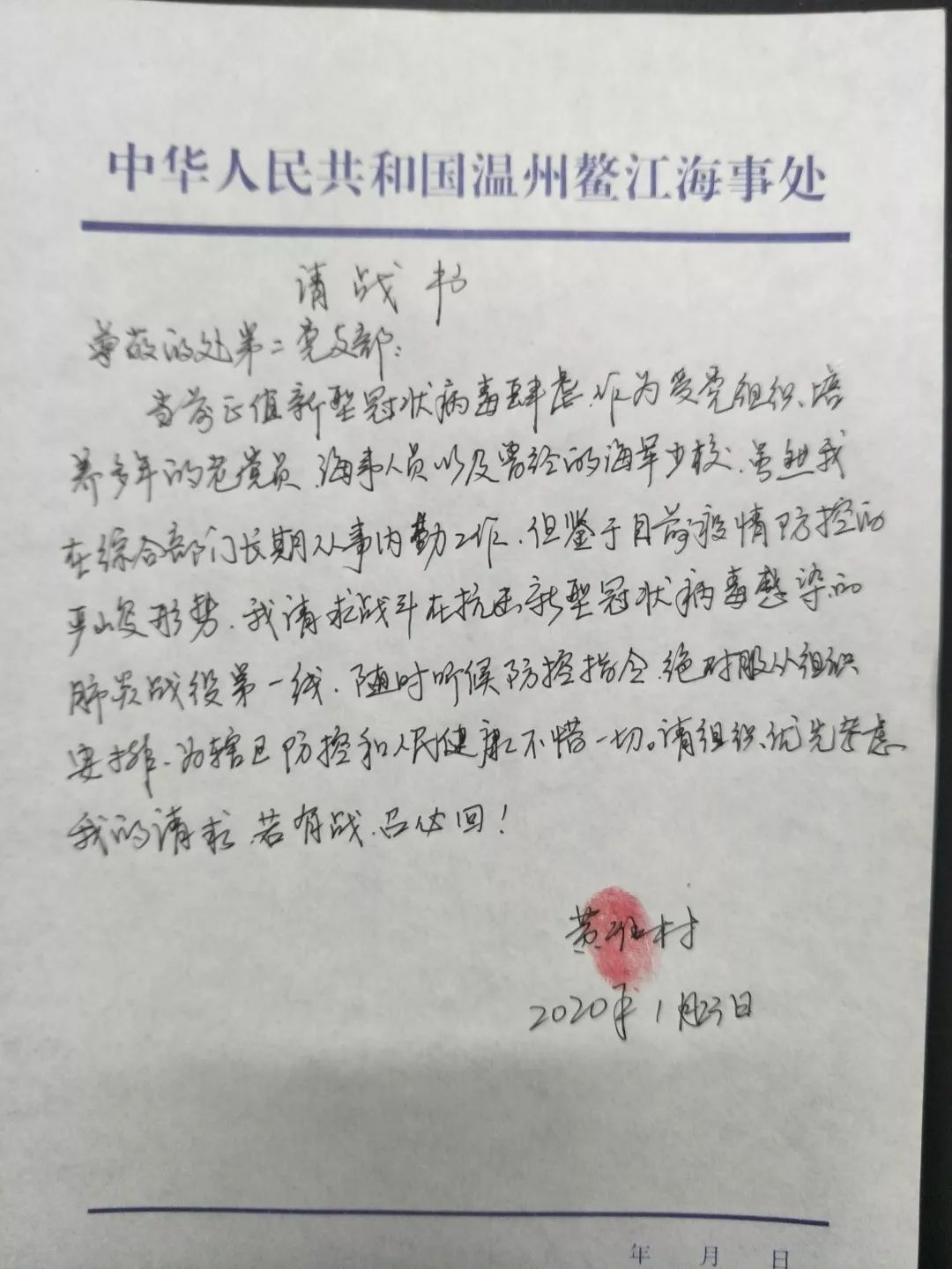 這封按著紅手印的請戰(zhàn)書,來自溫州鰲江海事處第二黨支部黃準(zhǔn)村同志,一位黨齡接近30年的老黨員、曾經(jīng)的海軍航空兵少校。