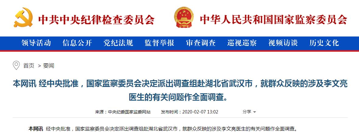 國(guó)家監(jiān)察委員會(huì)決定派出調(diào)查組赴湖北省武漢市就群眾反映的涉及李文亮醫(yī)生的有關(guān)問(wèn)題作全面調(diào)查,據(jù)中央紀(jì)委國(guó)家監(jiān)委網(wǎng)站消息,經(jīng)中央批準(zhǔn),國(guó)家監(jiān)察委員會(huì)決定派出調(diào)查組赴湖北省武漢市,就群眾反映的涉及李文亮醫(yī)生的有關(guān)問(wèn)題作全面調(diào)查。