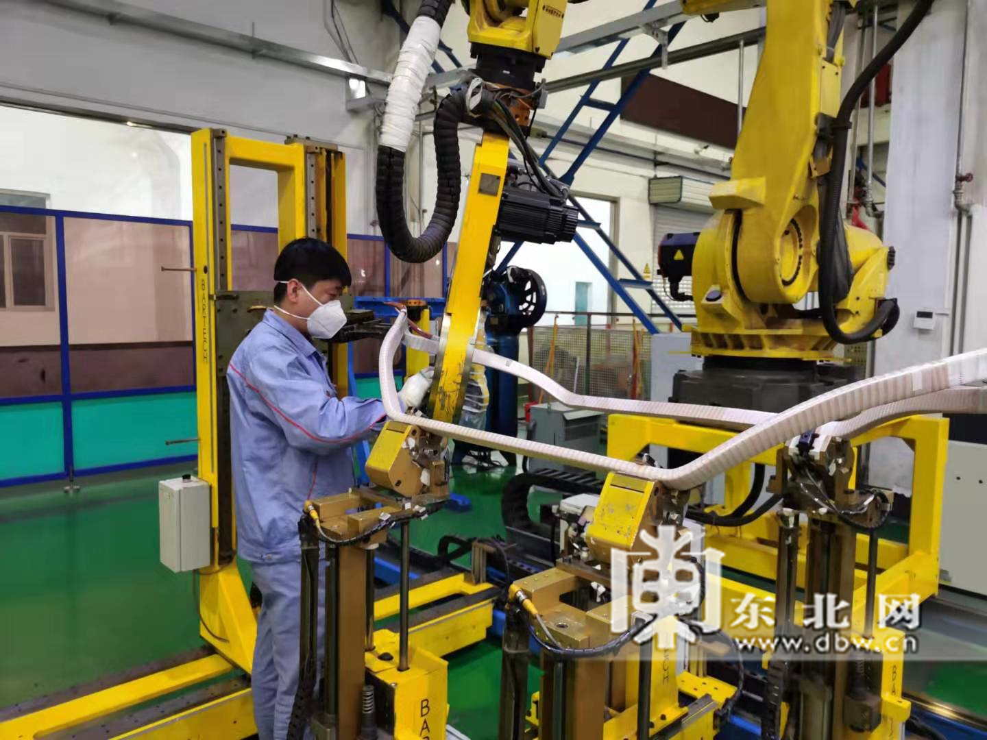 車間里,工人佩戴口罩工作。