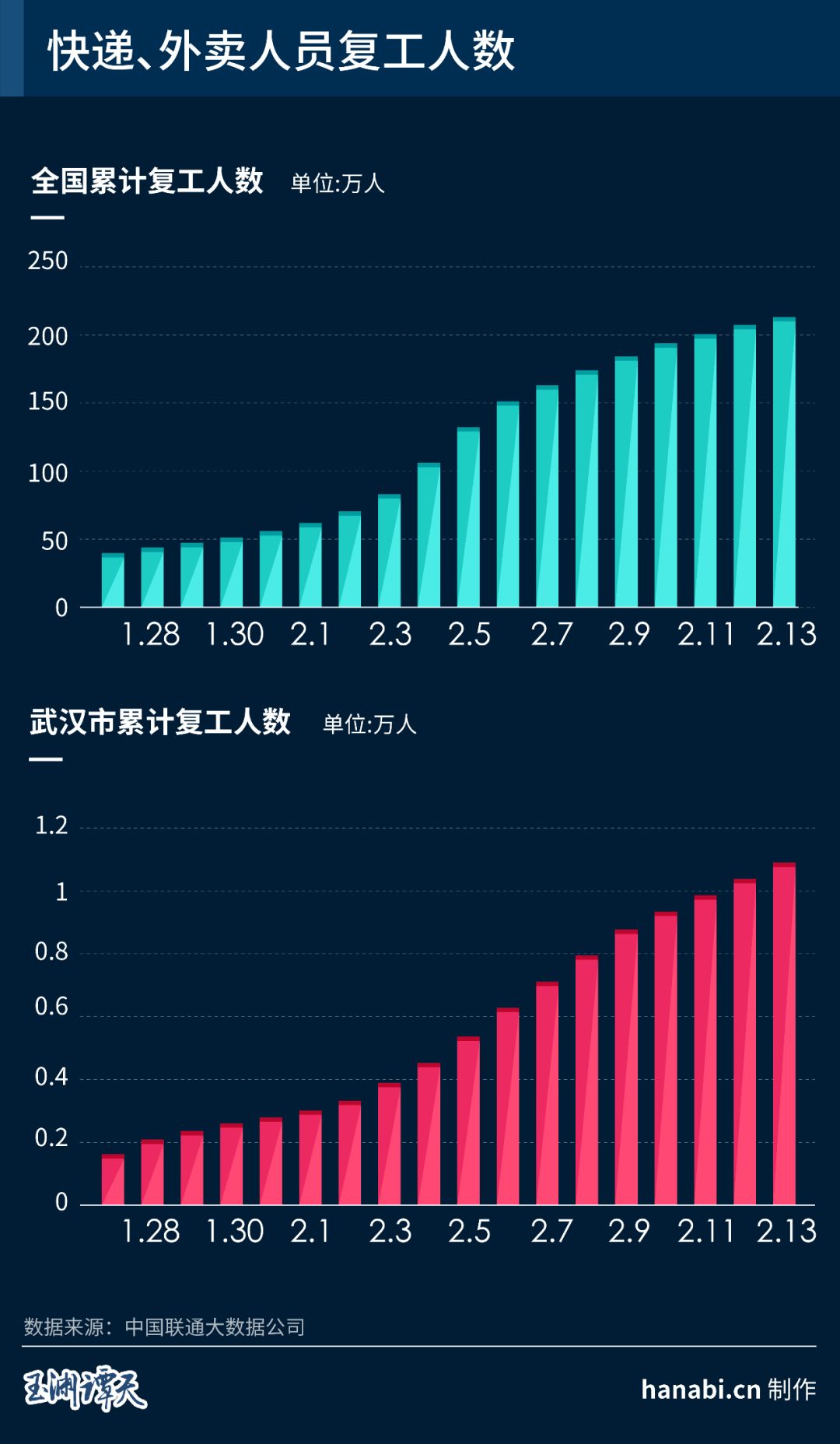 這意味著,10號之前,許多快遞和外賣小哥已經(jīng)先行一步,返回崗位。截至2月13日,全國外賣和快遞人員復(fù)工人數(shù)達213萬人,復(fù)工比例62.33%。