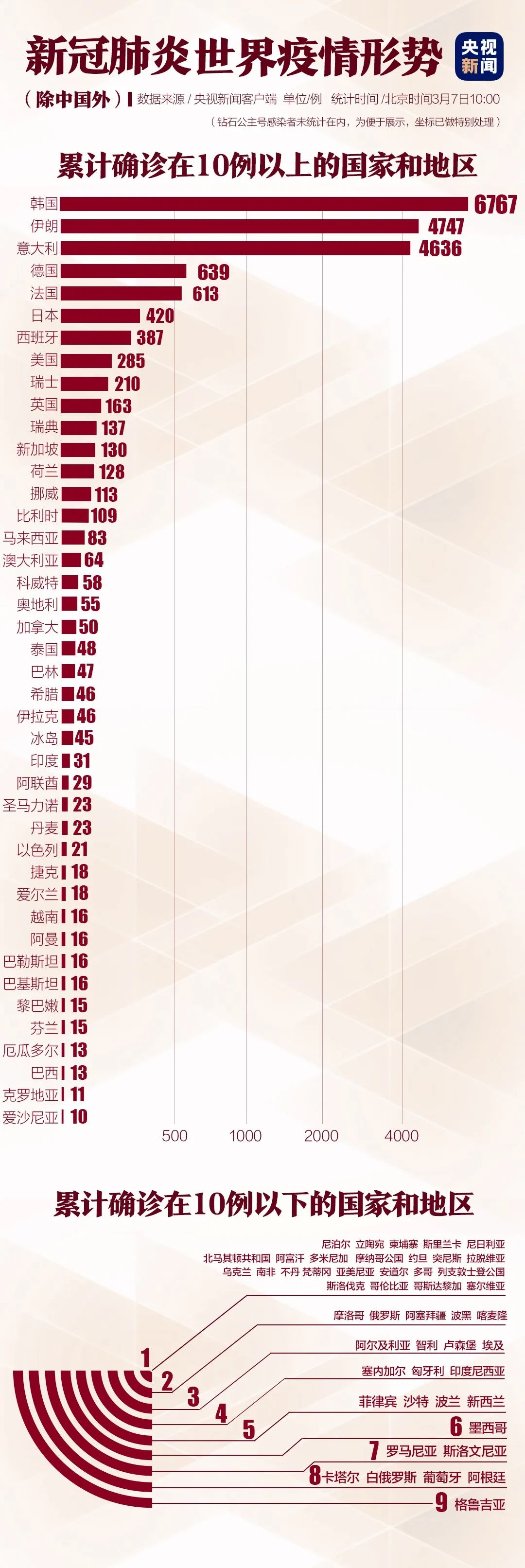 世界衛(wèi)生組織6日公布的最新數(shù)據(jù)顯示,截至歐洲中部時間6日10時(北京時間6日17時),中國境外新冠肺炎病例較前一日增加2727例,達到17481例;死亡病例較前一日增加69例,達到335例。