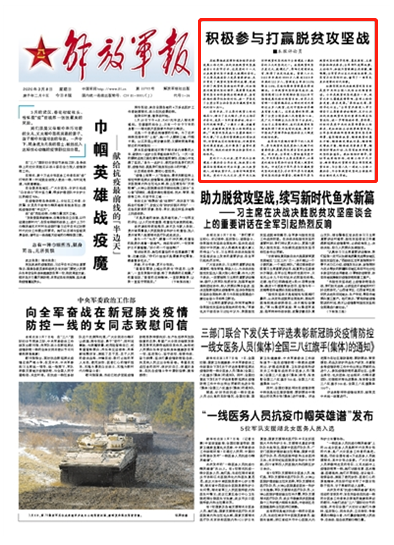 如期實(shí)現(xiàn)決戰(zhàn)決勝脫貧攻堅(jiān)目標(biāo)是黨中央向全國人民作出的鄭重承諾。今年是脫貧攻堅(jiān)戰(zhàn)最后一年,收官之年又遭遇疫情影響,各項(xiàng)工作任務(wù)更重、要求更高!捌渥魇家埠,其將畢也必巨!比姽俦钊雽W(xué)習(xí)領(lǐng)會(huì)習(xí)主席重要講話精神,充分認(rèn)識(shí)決戰(zhàn)決勝脫貧攻堅(jiān)的重要性艱巨性緊迫性,進(jìn)一步增強(qiáng)使命感、責(zé)任感,對(duì)標(biāo)對(duì)表黨中央的決策部署和工作要求,更加積極主動(dòng)投身脫貧攻堅(jiān)。全軍各級(jí)要按照國家脫貧攻堅(jiān)總體部署,落實(shí)精準(zhǔn)扶貧、精準(zhǔn)脫貧的基本方略,精準(zhǔn)確定幫扶對(duì)象,精準(zhǔn)制定幫扶方案,精準(zhǔn)使用資源力量,精準(zhǔn)組織幫扶行動(dòng),扎實(shí)有效抓好脫貧攻堅(jiān)任務(wù)落實(shí)。要加強(qiáng)組織領(lǐng)導(dǎo),密切軍地團(tuán)結(jié)協(xié)作,創(chuàng)新工作方式方法,確保幫扶的貧困對(duì)象全部實(shí)現(xiàn)脫貧目標(biāo),與全國人民一道邁入全面小康社會(huì),為奪取脫貧攻堅(jiān)戰(zhàn)全面勝利作出新的更大貢獻(xiàn)。
