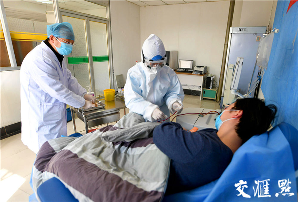 [宿遷]2月22日,醫(yī)護(hù)人員為當(dāng)?shù)厥孜痪璜I(xiàn)血漿的新冠肺炎康復(fù)者魯先生采集血漿。鄭緒軍 攝
