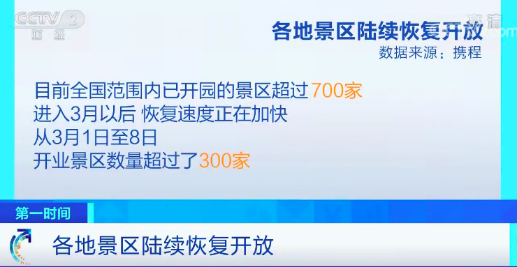 在民航市場(chǎng)逐步回暖的同時(shí),各地景區(qū)也正在逐步恢復(fù)開放。攜程的不完全統(tǒng)計(jì)顯示,目前全國范圍內(nèi)已開園的景區(qū)超過700家,特別是進(jìn)入3月以后,恢復(fù)速度正在加快,從3月1日至8日,開業(yè)景區(qū)數(shù)量就超過了300家。而這也被視為旅游業(yè)恢復(fù)的第一步。