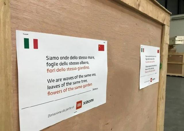 在這批物資上用英語和意大利語印著古羅馬時代哲學家賽內(nèi)加的一句話:我們是同一片大海的海浪,同一棵樹上的樹葉,同一座花園里的花朵。