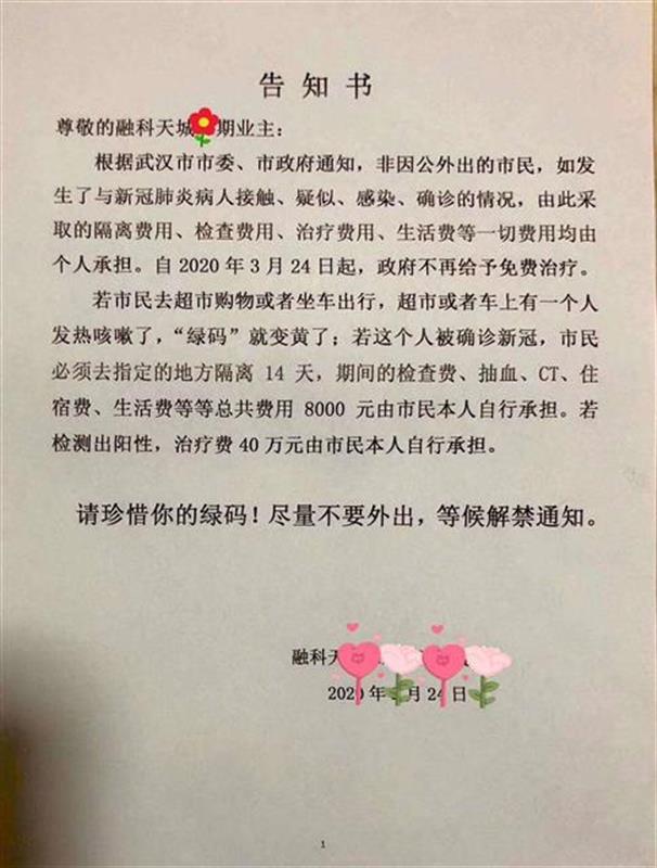 “自2020年3月24日起武漢市政府不再對新冠肺炎病人免費治療?”3月25日,網上流傳多個小區(qū)給業(yè)主(住戶)的《告知書》,相關信息引發(fā)網友熱議。記者從武漢市多個部門了解獲悉,該信息不屬實。