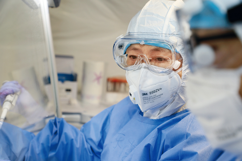 中國工程院院士、軍事醫(yī)學(xué)研究院研究員陳薇,曾在阻擊非典、抗擊埃博拉等多場硬仗中作出重要貢獻(xiàn)。今年農(nóng)歷正月初二,她就帶領(lǐng)專家組緊急進(jìn)駐武漢,全力進(jìn)行科研攻關(guān)。2020年3月16日,陳薇團(tuán)隊研制的重組新冠疫苗獲批進(jìn)入臨床試驗。圖為陳薇在臨時搭建的帳篷式移動實驗室做檢測。 央廣軍事記者 張振威/攝