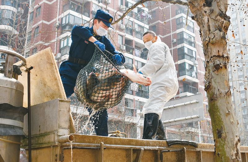 2020年3月13日,一批運到武漢社區(qū)的活魚正在卸貨。當(dāng)日,首批100噸調(diào)配自湖北省咸寧市的活魚運抵武漢市硚口區(qū)11個街道下轄社區(qū)。 新華社記者 程敏/攝
