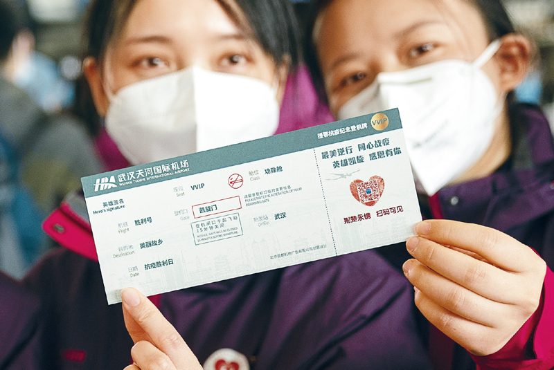 廣大醫(yī)務(wù)工作者是這次戰(zhàn)“疫”的“最大的功臣”。新冠肺炎疫情發(fā)生以來,29個省區(qū)市和新疆生產(chǎn)建設(shè)兵團(tuán)、軍隊等調(diào)派340多支醫(yī)療隊、42000多名醫(yī)務(wù)人員緊急馳援湖北。隨著防控形勢逐步向好,首批支援湖北國家醫(yī)療隊于2020年3月17日踏上返程之路。圖為兩名國家緊急醫(yī)學(xué)救援隊隊員展示武漢天河機(jī)場特別準(zhǔn)備的“勝利號”登機(jī)牌。 新華社記者 熊琦/攝