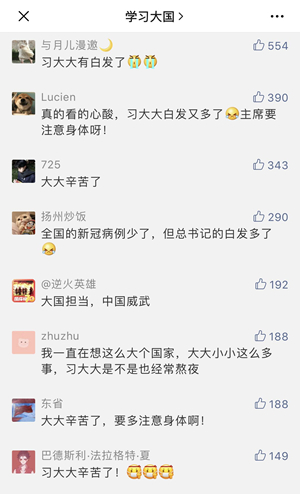 從新聞鏡頭中,有網(wǎng)友敏銳地關(guān)注到一個(gè)細(xì)節(jié):“全國新冠肺炎病例少了,總書記的白發(fā)卻多了”。很多人留言傾述自己的關(guān)切之情。