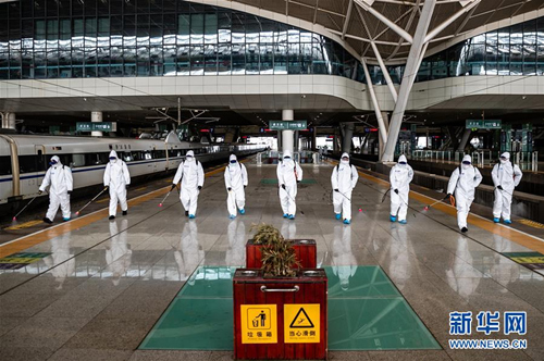 3月24日,消防員對武漢火車站站臺(tái)進(jìn)行全面消殺。