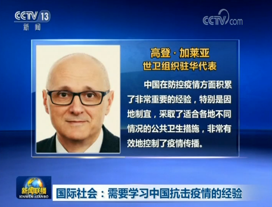 世衛(wèi)組織5日的報(bào)告援引世衛(wèi)組織駐華代表高登·加萊亞的話說,中國(guó)在防控疫情方面積累了非常重要的經(jīng)驗(yàn),特別是因地制宜,采取了適合各地不同情況的公共衛(wèi)生措施,非常有效地控制了疫情傳播。加萊亞表示,中國(guó)人民為遏制疫情傳播做出巨大努力,產(chǎn)生積極成效。各國(guó)應(yīng)共同協(xié)作分享抗疫經(jīng)驗(yàn)和疫情信息,互相借鑒學(xué)習(xí),采取及時(shí)有效的防控措施。