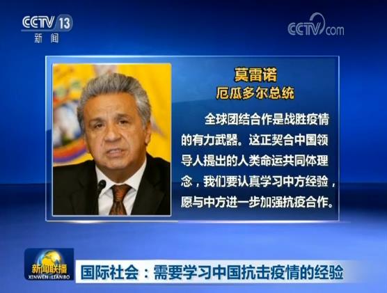 厄瓜多爾總統(tǒng)莫雷諾表示,全球團(tuán)結(jié)合作是戰(zhàn)勝疫情的有力武器。這正契合中國(guó)領(lǐng)導(dǎo)人提出的人類命運(yùn)共同體理念,我們要認(rèn)真學(xué)習(xí)中方經(jīng)驗(yàn),愿與中方進(jìn)一步加強(qiáng)抗疫合作。