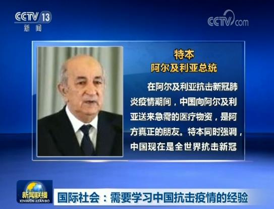 阿爾及利亞總統(tǒng)特本表示,在阿爾及利亞抗擊新冠肺炎疫情期間,中國(guó)向阿爾及利亞送來急需的醫(yī)療物資,是阿方真正的朋友。特本同時(shí)強(qiáng)調(diào),中國(guó)現(xiàn)在是全世界抗擊新冠肺炎疫情中少數(shù)有能力為其他國(guó)家提供醫(yī)療援助和支持的力量。