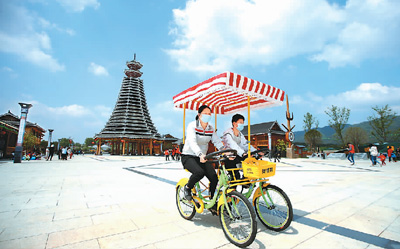 4月起,江西省吉安市峽江縣落實景區(qū)門票優(yōu)惠、免費發(fā)放消費卡券等8條“給閑又給錢”的硬舉措,促進消費。圖為峽江縣金坪民族鄉(xiāng)民族風情園內(nèi),游客在騎行。