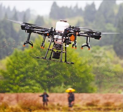 4月22日,四川內(nèi)江市石子鎮(zhèn),無(wú)人機(jī)在田間開(kāi)展水稻直播作業(yè)。
