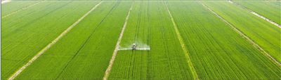 4月14日,在安徽懷遠(yuǎn)縣的農(nóng)場(chǎng)里,工作人員駕駛農(nóng)機(jī)給小麥噴灑農(nóng)藥。