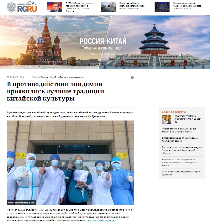 30日,《俄羅斯報(bào)》官網(wǎng)發(fā)表題為《疫情大考面前,彰顯中華優(yōu)秀傳統(tǒng)文化底色》的文章。文章稱,在中華優(yōu)秀傳統(tǒng)文化中,提倡“出入相友,守望相助”。習(xí)近平主席一直強(qiáng)調(diào)“中國(guó)人民是具有偉大團(tuán)結(jié)精神的人民”,“始終團(tuán)結(jié)一心、同舟共濟(jì)”。這一點(diǎn)在抗疫中也得到深刻體現(xiàn)。人們看到,在武漢“封城”的70多天里,武漢人并不孤單——來(lái)自中國(guó)各地的醫(yī)療和生活物資源源不斷地運(yùn)抵武漢,全體中國(guó)人都在以各種方式為武漢加油打氣,海外華人也紛紛捐款捐物,這成為中華民族大家庭眾志成城、戰(zhàn)勝困難的真實(shí)寫照。