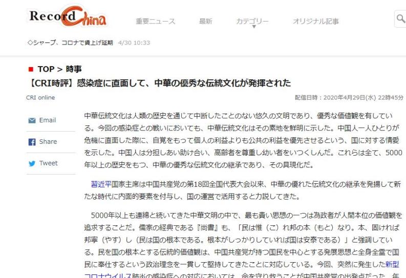 30日,日本網(wǎng)站Record China還刊發(fā)題為《面對(duì)疫情,中華優(yōu)秀傳統(tǒng)文化得到充分發(fā)揮》的文章。文章稱,在這場(chǎng)防疫過(guò)程中,中華傳統(tǒng)文化彰顯出優(yōu)秀本色。每一個(gè)中國(guó)人在面臨危機(jī)的時(shí)候,都會(huì)自覺(jué)地以公共利益優(yōu)先于個(gè)人利益,體現(xiàn)出對(duì)國(guó)家的愛(ài)。中國(guó)人互相分擔(dān)、互相幫助,尊老愛(ài)幼。