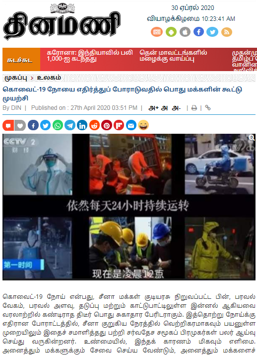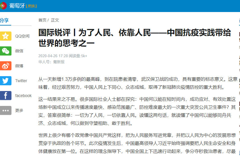 《每日鐘聲報(bào)》也在其官網(wǎng)發(fā)文指出,面對(duì)疫情,中國(guó)這個(gè)人口大國(guó)行動(dòng)迅速、措施有力,體現(xiàn)了政府的高效率。在對(duì)抗新冠疫情的斗爭(zhēng)中,普通的中國(guó)人民展示了令人稱贊的力量。