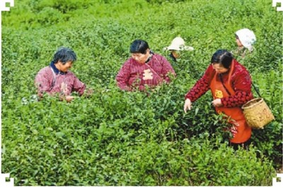 貧困戶陳霞和村里姐妹們?cè)缭缵s來采摘春茶,臉上綻放著春花般幸福的笑容!懊髑安,貴如金。”她一雙手左右開弓,不停地在茶叢中翻飛輕點(diǎn),采摘芽苞,并笑言,一季春茶采下來能增收三千多塊。