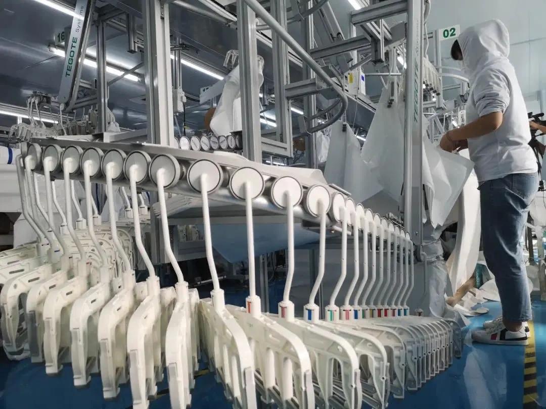 傳統(tǒng)服裝生產(chǎn)線轉(zhuǎn)產(chǎn)防護服最大的改變,同時也是制造中最重要的一步就是熱封。防護服上所有縫接位必須全部封起來,不留針眼,防止細(xì)菌入侵,此外還要保證使用過程中不易被撕開。對此,華沙利自主研發(fā)的“KR無縫”技術(shù)發(fā)揮了重要的作用,“一件防護服有8000針,還(需要)有11米的膠條封閉,這個工藝的難度還是比較大的,相對口罩的工藝來講,它的自動化水平(要求)會更高!