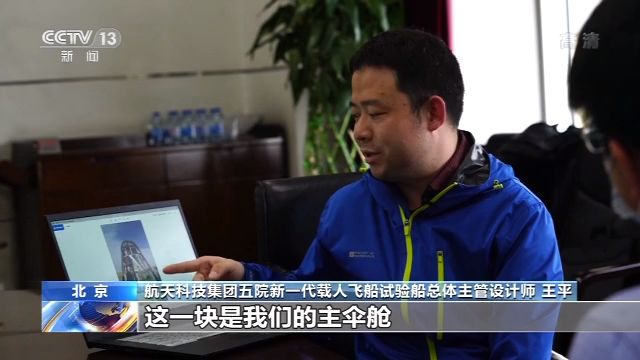 航天科技集團(tuán)五院新一代載人飛船試驗(yàn)船總體主管設(shè)計(jì)師 王平:這一塊是我們的主傘艙,上面這兩個(gè)筒,是它的減速傘的彈傘筒。