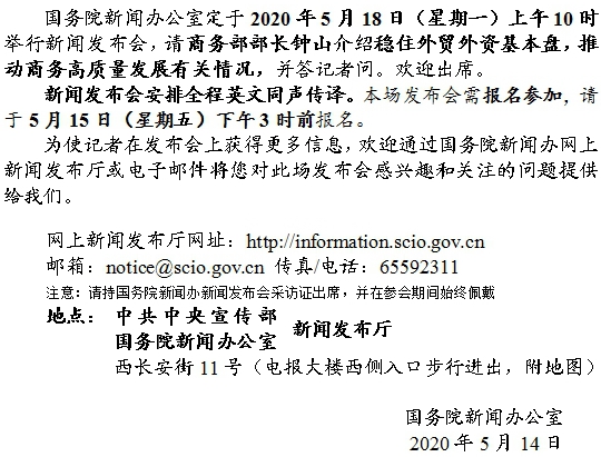 國(guó)務(wù)院新聞辦公室定于5月18日(星期一)10時(shí)舉行新聞發(fā)布會(huì),請(qǐng)商務(wù)部部長(zhǎng)鐘山介紹穩(wěn)住外貿(mào)外資基本盤,推動(dòng)商務(wù)高質(zhì)量發(fā)展有關(guān)情況并答記者問。