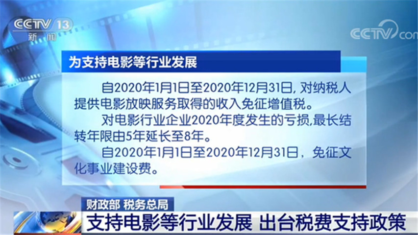 財政部、稅務(wù)總局:支持電影等行業(yè)發(fā)展 出臺稅費支持政策,財政部、國家稅務(wù)總局昨天(14日)發(fā)布公告,為支持電影等行業(yè)發(fā)展,自2020年1月1日至2020年12月31日,對納稅人提供電影放映服務(wù)取得的收入免征增值稅。對電影行業(yè)企業(yè)2020年度發(fā)生的虧損,最長結(jié)轉(zhuǎn)年限由5年延長至8年,也就是可以在以后8年中,抵減稅前利潤,少交稅。