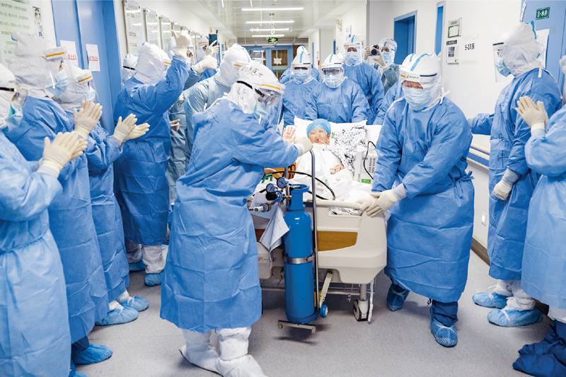在此次抗疫斗爭(zhēng)中,全國(guó)廣大醫(yī)務(wù)工作者不忘初心、牢記使命,響應(yīng)黨的號(hào)召,義無(wú)反顧沖上疫情防控第一線,同時(shí)間賽跑,與病魔較量,頑強(qiáng)拼搏、日夜奮戰(zhàn),展現(xiàn)了對(duì)黨、對(duì)人民高度負(fù)責(zé)的精神面貌,生動(dòng)詮釋了偉大的中華民族精神。圖為2020年4月12日,北京協(xié)和醫(yī)院醫(yī)療隊(duì)隊(duì)員與武漢同濟(jì)醫(yī)院醫(yī)務(wù)人員共同將病區(qū)最后一名新冠肺炎危重癥患者轉(zhuǎn)往武漢同濟(jì)醫(yī)院中法新城院區(qū)ICU。 新華社記者 沈伯韓/攝