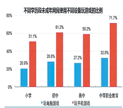 除了學(xué)習(xí)之外,網(wǎng)絡(luò)已經(jīng)成為未成年人娛樂和社交的重要工具!秷蟾妗凤@示,聽音樂和玩游戲繼續(xù)是目前未成年網(wǎng)民的主要網(wǎng)上娛樂活動,分別為65.9%和61.0%。前者作為未成年人的娛樂方式為家長、學(xué)校等各方所接受,但是后者引起很多爭議。近年來,網(wǎng)絡(luò)游戲行業(yè)發(fā)展迅速,伴隨智能手機的普及,向未成年群體的滲透更加快速。調(diào)查顯示,61.0%的未成年網(wǎng)民會經(jīng)常在網(wǎng)上玩游戲,手機是未成年人上網(wǎng)玩游戲的主要設(shè)備。小學(xué)生網(wǎng)民玩手機游戲的比例超過一半;初中和高中生網(wǎng)民玩手游的比例分別為61.2%和59.2%;中職學(xué)生網(wǎng)民達到71.7%。短視頻是近幾年蓬勃興起的互聯(lián)網(wǎng)娛樂服務(wù)。2019年未成年網(wǎng)民在互聯(lián)網(wǎng)上經(jīng)常收看短視頻的比例達到46.2%,較2018年的40.5%提升5.7個百分點。