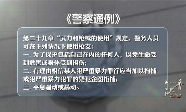 按照香港《警察通例》第二十九章“武力和槍械的使用”規(guī)定,警務(wù)人員可在下列情況下使用槍支: