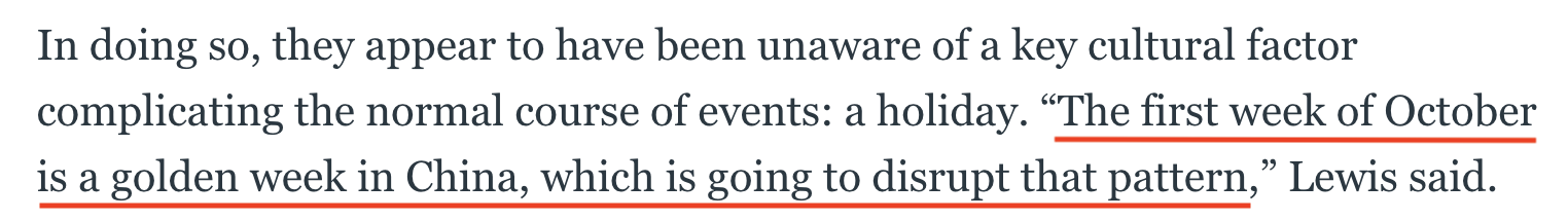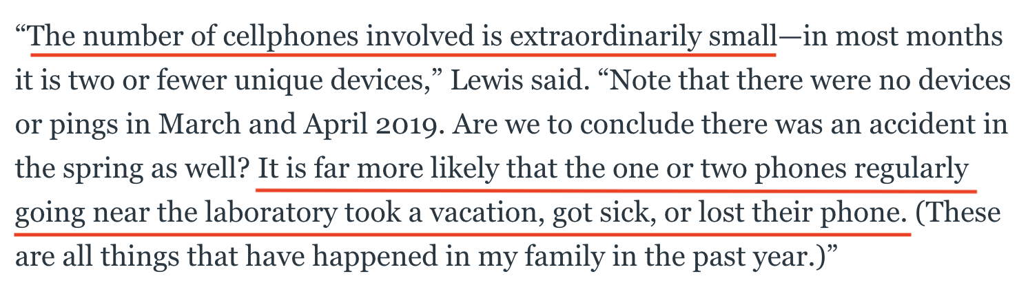 蒙特雷國際研究院教授杰弗里·劉易斯表示:“報告中涉及的樣本數(shù)量非常少,不足以證明任何東西。最多只能說明,經(jīng)常在病毒研究所附近出現(xiàn)的手機(jī)用戶在這個時間段可能去度假了,也可能生病了,或者丟了手機(jī)。此外,10月的第一周是中國的黃金周,MACE的研究人員似乎沒有意識到這一關(guān)鍵性因素!