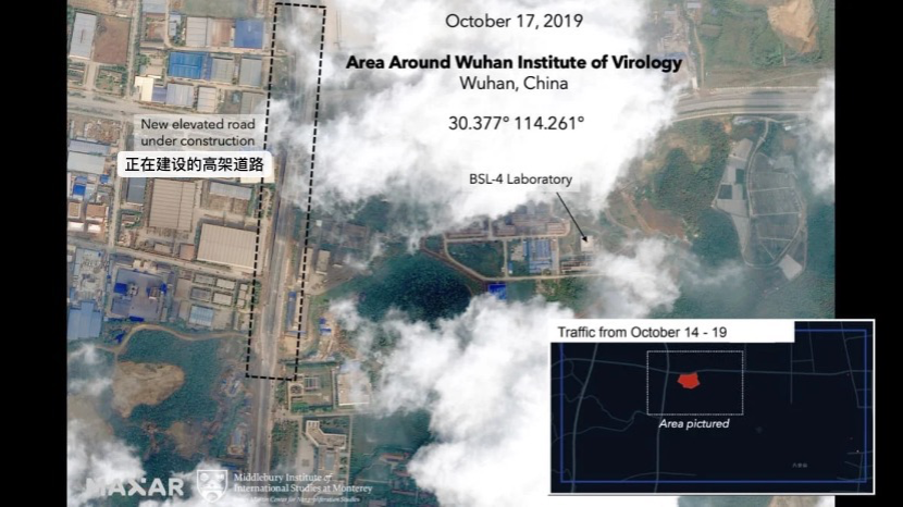 漏洞二:報告認(rèn)為,新冠病毒來自武漢病毒研究所的核心依據(jù)是去年10月中旬,武漢病毒研究所外面的公路設(shè)置了大量“路障”。10月14日至19日,病毒所附近 “沒有任何(車輛)交通”。