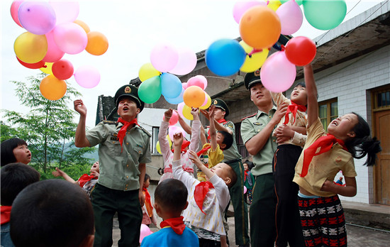 武警官兵在桑植縣汨湖鄉(xiāng)國營農(nóng)墾小學(xué)與孩子們做游戲,樂在其中。