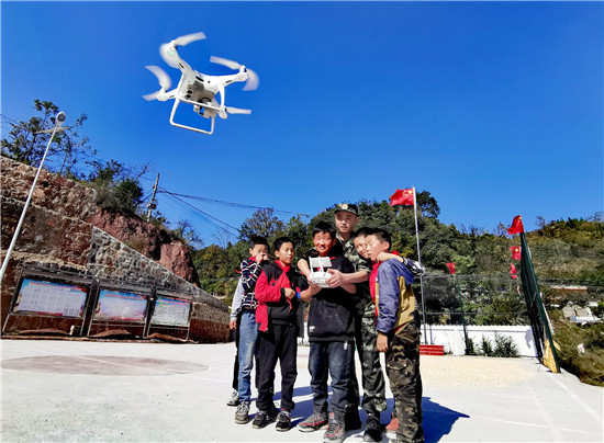 武警官兵在桑植縣空殼樹鄉(xiāng)蓮花臺村為孩子們教授無人機操作。