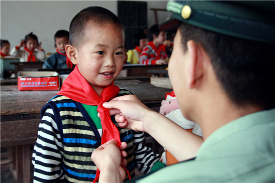 武警官兵在桑植縣汨湖鄉(xiāng)國營農(nóng)墾小學(xué)給孩子們系上紅領(lǐng)巾。