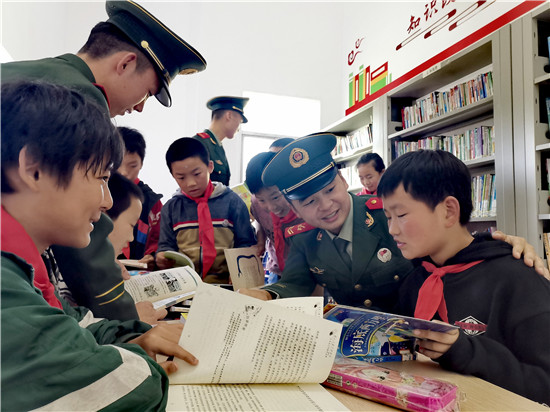 武警官兵在桑植縣空殼樹鄉(xiāng)蓮花臺村援建圖書閱覽室,關(guān)心孩子學(xué)習(xí)成長。