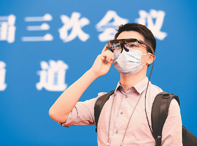 5月24日,北京人民大會(huì)堂新聞發(fā)布廳,全國政協(xié)十三屆三次會(huì)議第二場“委員通道”采訪活動(dòng)舉行。記者在“委員通道”使用AR眼鏡拍攝會(huì)場視頻,實(shí)時(shí)傳回給后方編輯。