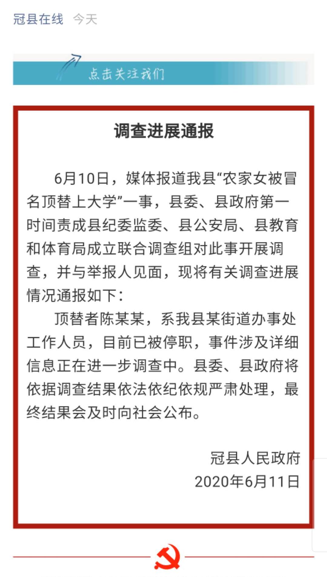頂替者陳某某,系冠縣某街道辦事處工作人員,目前已被停職,事件涉及詳細(xì)信息正在進(jìn)一步調(diào)查中。縣委、縣政府將依據(jù)調(diào)查結(jié)果依法依紀(jì)依規(guī)嚴(yán)肅處理,最終結(jié)果會及時向社會公布。(總臺央視記者 張明)